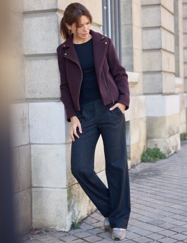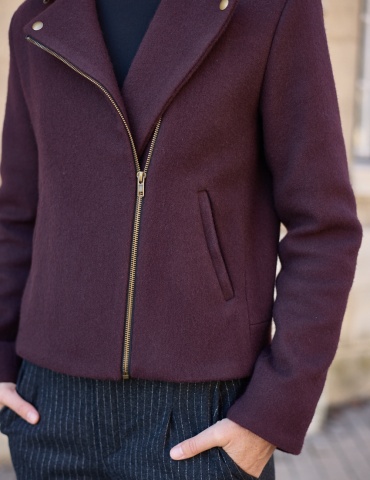 A zippered biker-inspired jacket featuring an asymmetric zipper closure and an optional snap-fastened collar. Its carefully placed side and back seams make the cut particularly flattering. Optional piped pockets can be added. The jacket is fully lined for a clean finish.